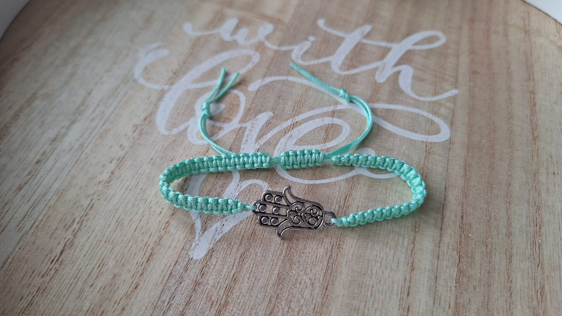 Makramee Armband mint grün, Hand der Fatima Anhänger silber
