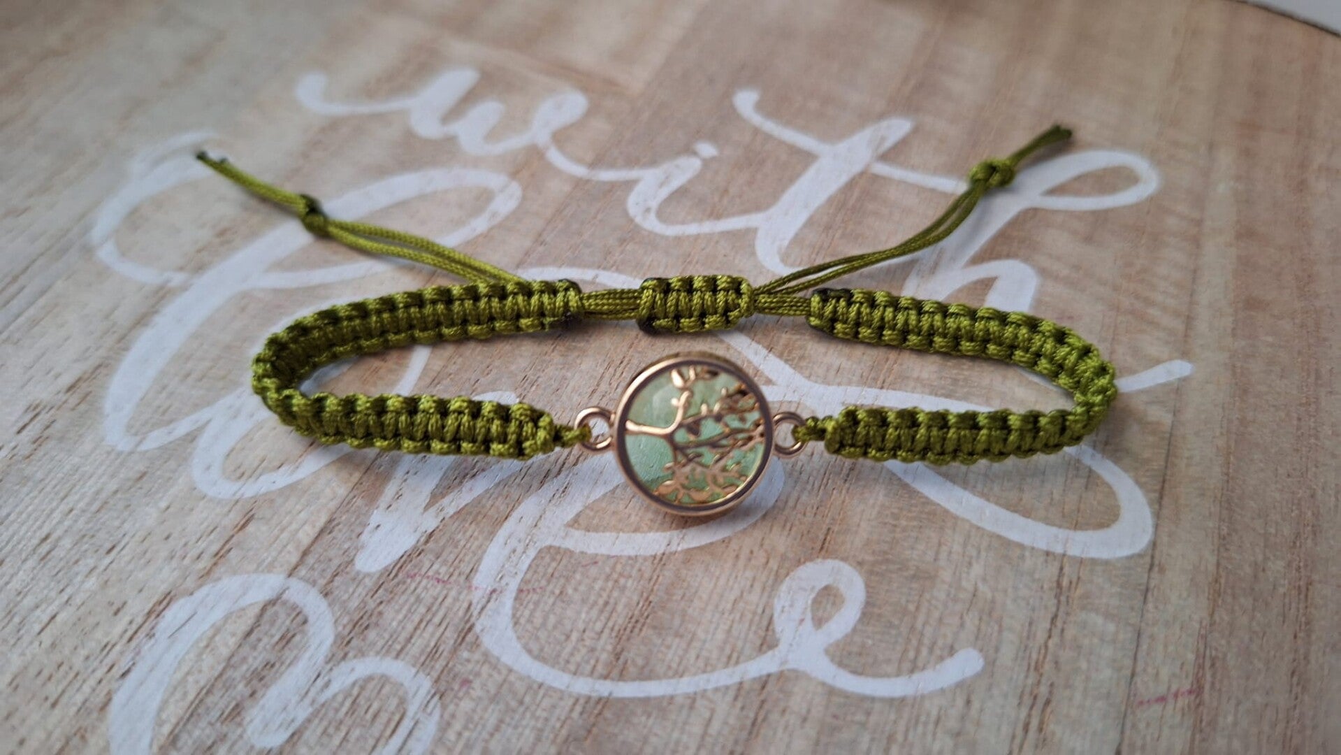 Makramee Armband olive, Lebensbaum gold