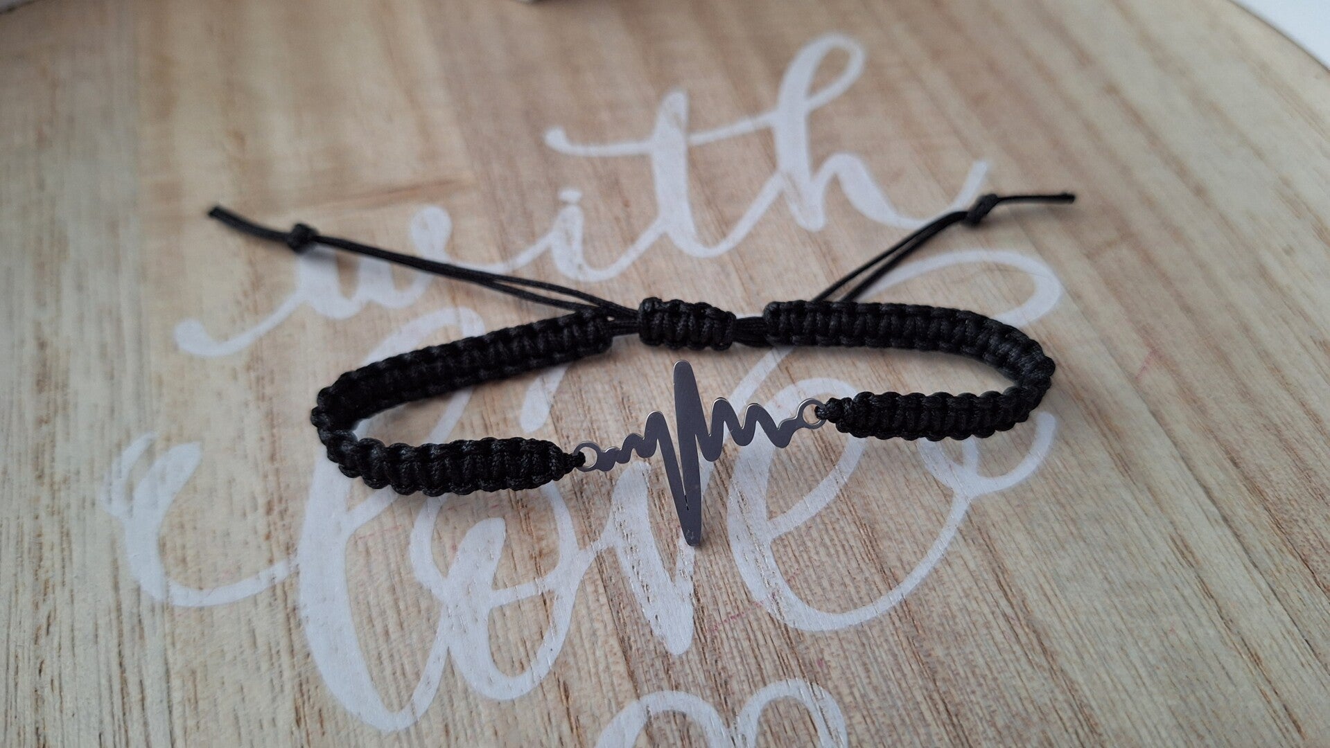 Makramee Armband schwarz, Herzschlag silber